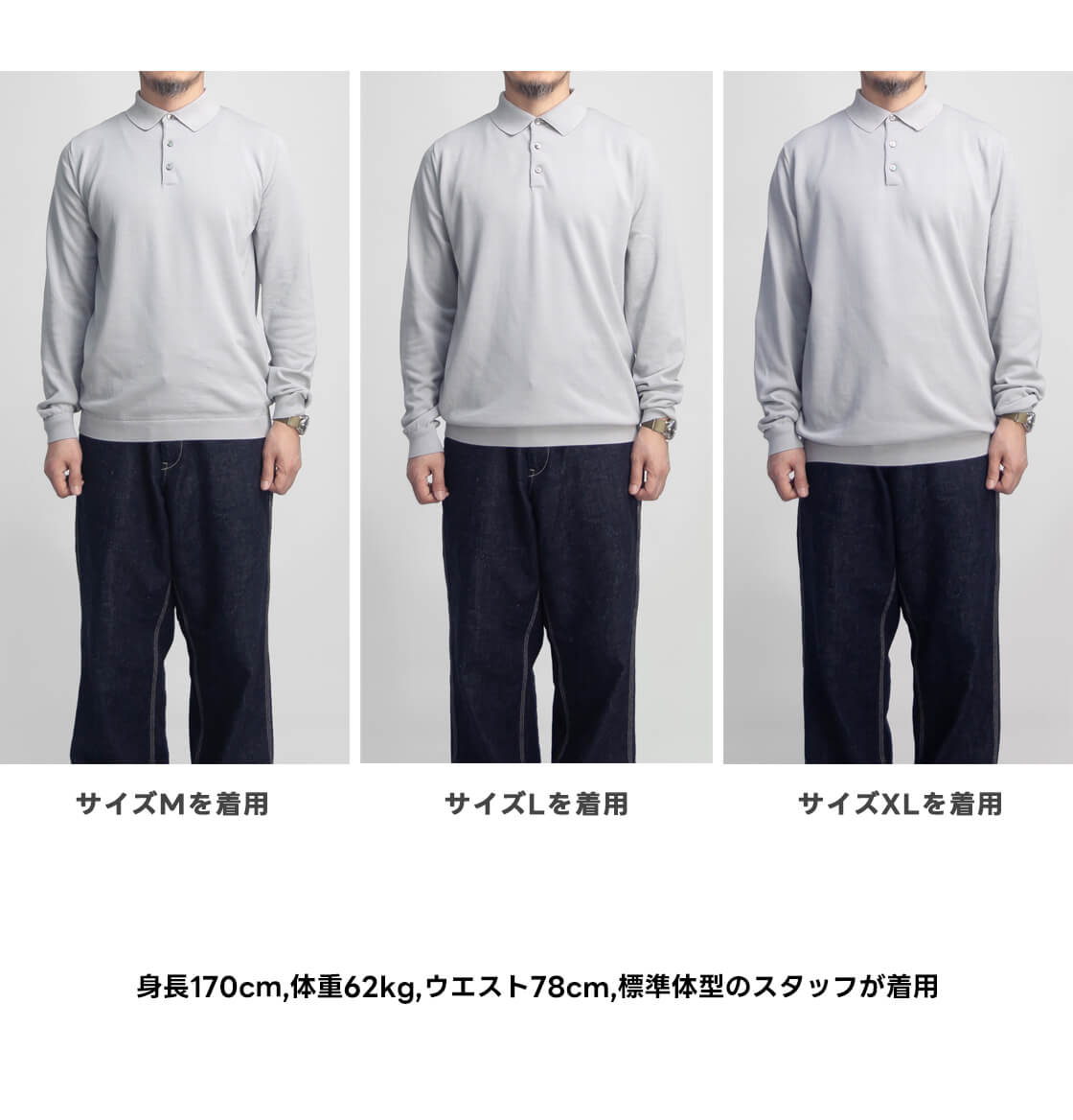 着てみるとひんやりと、カラッとして、暑い時期には袖を通した瞬間に心地よい。サイズ感に関しては、画像で私(身長170cm 体重62kg ウエスト78cm 標準体型 なで肩、肩幅狭め)でサイズMを着用していますがジャストからやや細めといった印象。個人的にはカジュアルシーンでゆったりと着用したいので、LかXLサイズが好みにはなります。春夏のMOONCASTLEと言えばのアイスコットンシリーズ。ニットと言えども暑苦しさは全くありませんし、ジャケットのインナー使いにも丁度良し。ぜひお試しください。