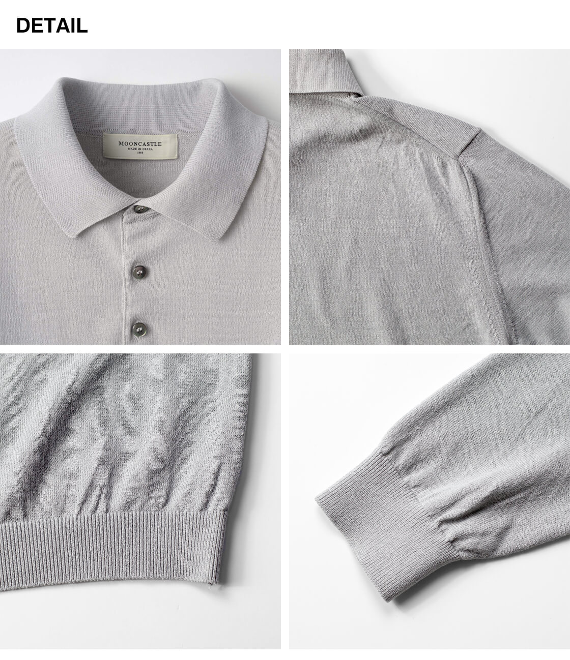 MOONCASTLE春夏の定番、麻の様な涼しげなシャリ感のあるドライタッチで夏でもさらっと爽やかなアイスコットンシリーズの長袖ポロニット。ニットと言えども暑苦しさはなくて、ジャケットのインナー使いにも丁度良い。